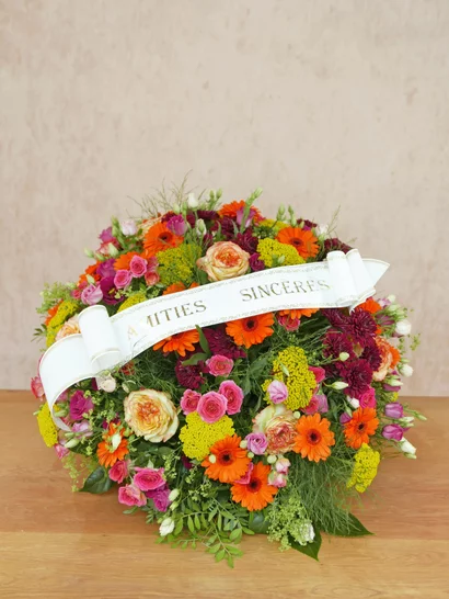 Nous réalisons des bouquets de condoléances à offrir aux familles, ainsi que des gerbes, coussins et couronnes funéraires conçus spécialement pour les cérémonies d’adieu.